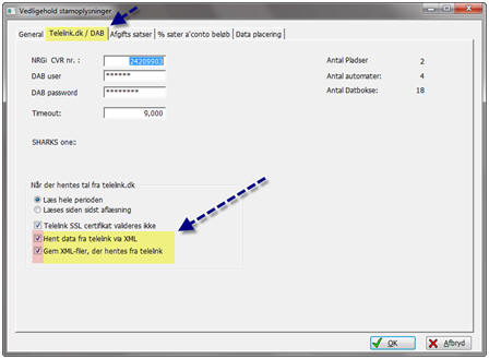 Under Filer finder du Stamoplysninger og fanebladet Telelink / DAB. Nederst på skærmbilledet skal du sætte flueben som vist. Når telelink den, 18 november starter deres nye hjemmeside. Du vil så være klar til kommunikere med telelink igen.